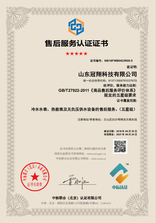 供水設備五星級售后服務認證證書